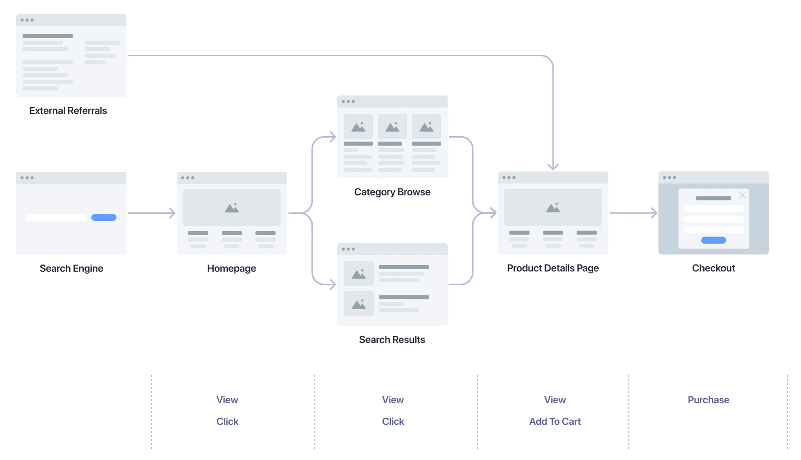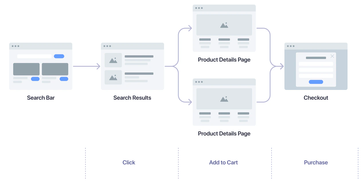 Map the steps users take through your website and send events for the actions that lead to the final goal: the product purchase.- Search results page