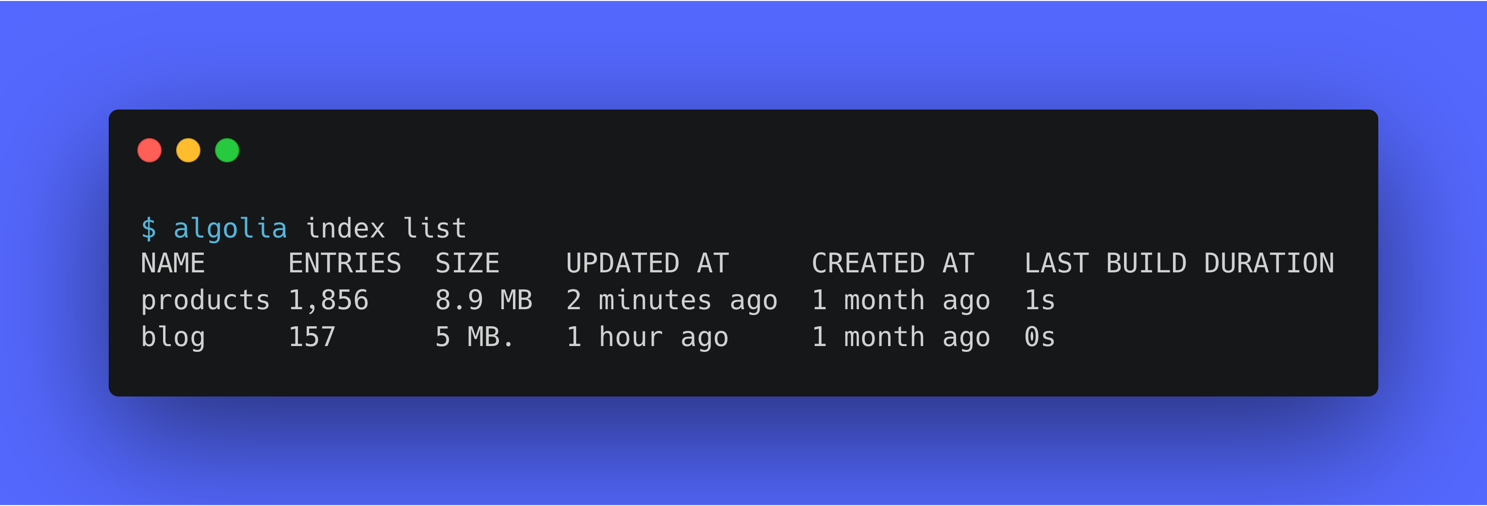 For example, to list all indices in your Algolia application, run: